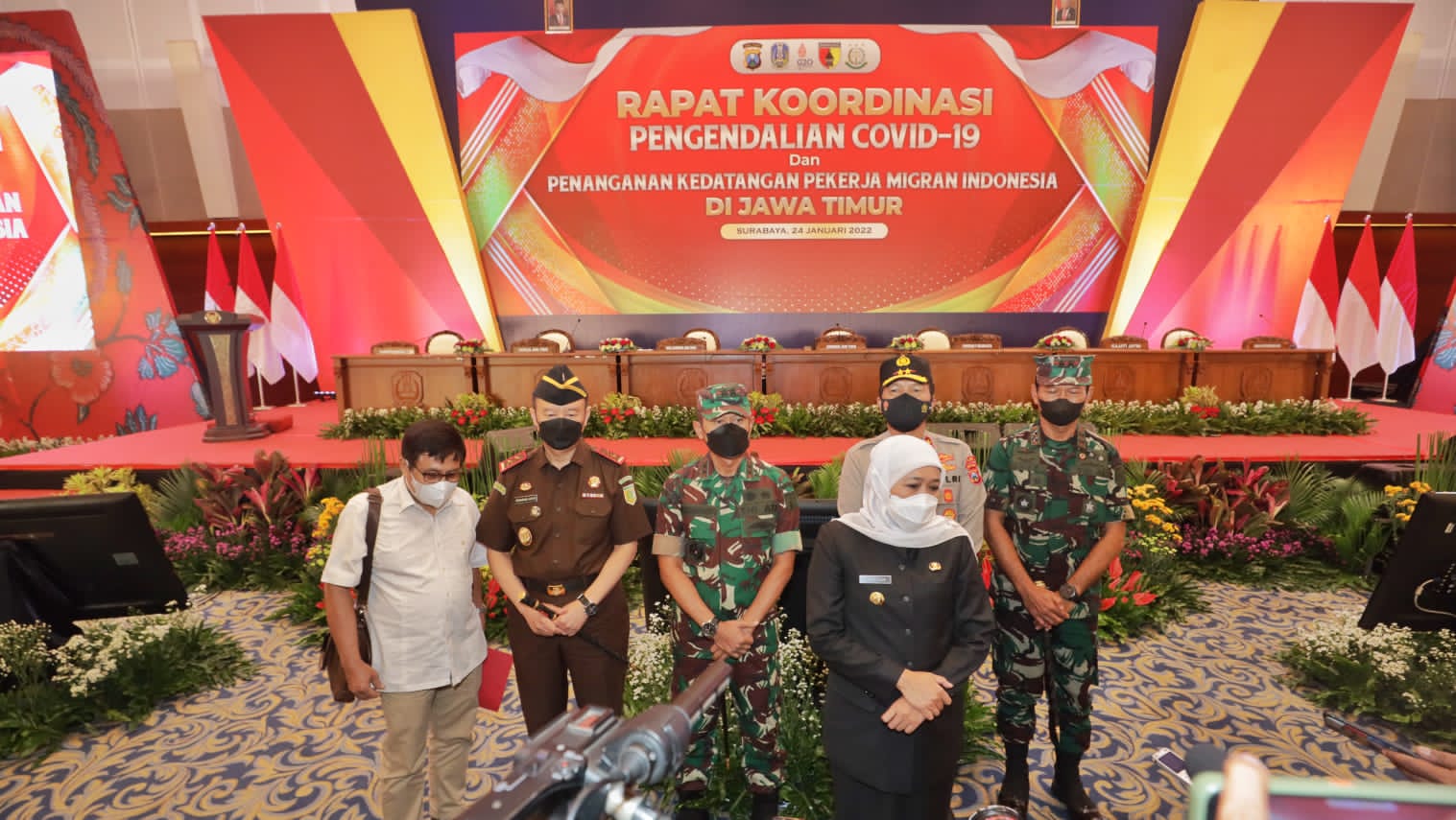 Medannewstv.com – Forkopimda Jatim menggelar Rapat Koordinasi Pengendalian Covid-19 dan Penanganan Kedatangan Pekerja Migran Indonesia Di Jawa Timur, pada Senin (24/1/2022) di Convention Hall Mall Grand City Surabaya.