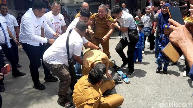 Kemudian Bobby terlihat di barisan paling belakang. Baru maju beberapa langkah dan kemudian jatuh bersama timnya. Sontak warga tertawa lepas tertawa melihat momen tersebut.